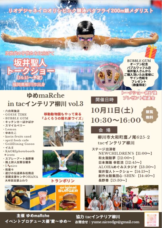 また、10月11日(土)はゆめmaRche様主催のイベントが同所にて開催されキッチンカー、飲食・物販テントなどが並び、ステージイベントもございます。